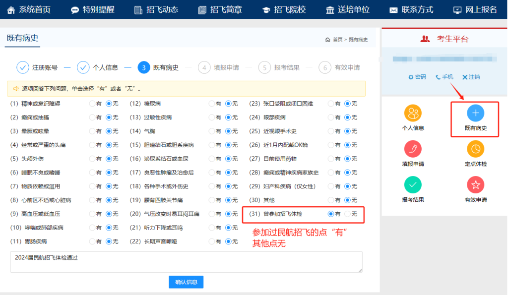 4、既有病史,参加过民航招飞的最后一项点“有”,并说明体检情况。否则点“无”。