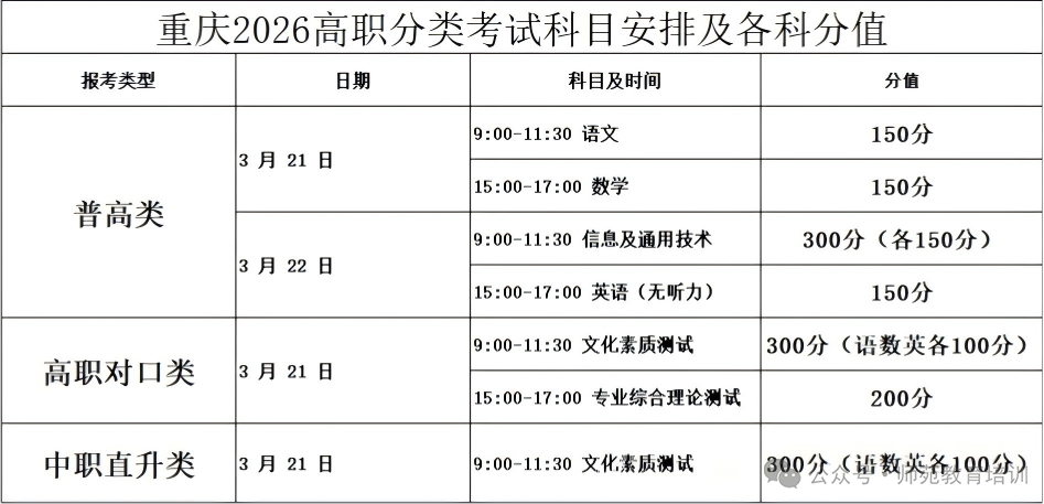 重庆2026高职分类考试科目时间安排