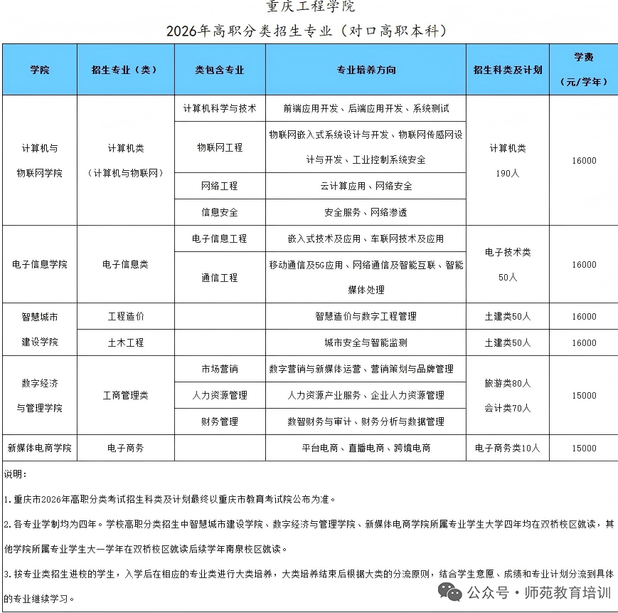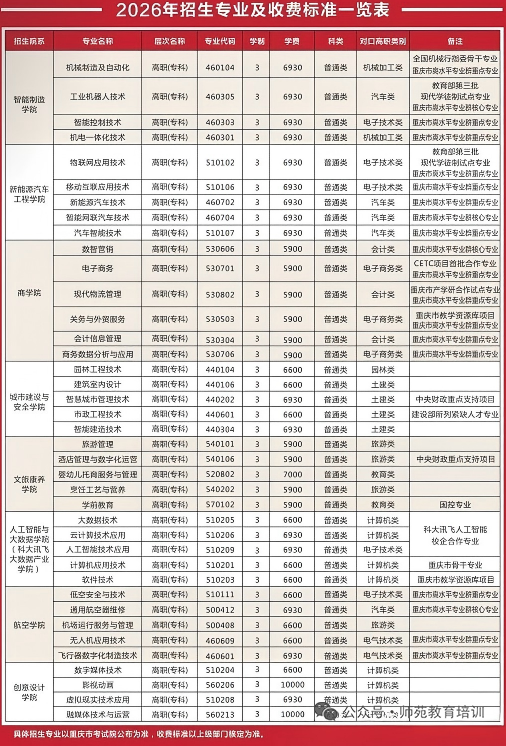 重庆城市职业学院2026年高考招生专业及收费标准