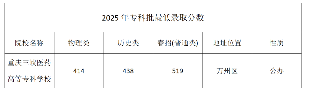 重庆三峡医药高等专科学校创建于1951年,2006年由重庆市万州卫生学校和重庆市万县中医药学校合并升格而成,是三峡库区唯一独立设置的全日制公办医药卫生类高等院校。现为国家优质专科高等职业院校、中国特色高水平专业群建设单位。